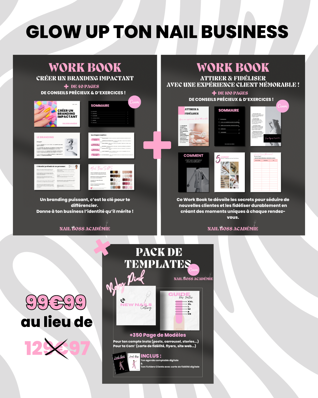 Prête à transformer ta communication et à faire décoller ton activité ? Avec le PACK "GÈRE TA COM' COMME UNE PRO", tu as TOUS les outils nécessaires pour attirer des clientes, avoir un branding IMPACTANT, optimiser ton compte Instagram et avoir une stratégie qui attire et qui convertit, et donc gérer ta com’ comme une vraie professionnelle. C'est le Pack NAIL BOSS ACADÉMIE le plus complet alors profites -en !