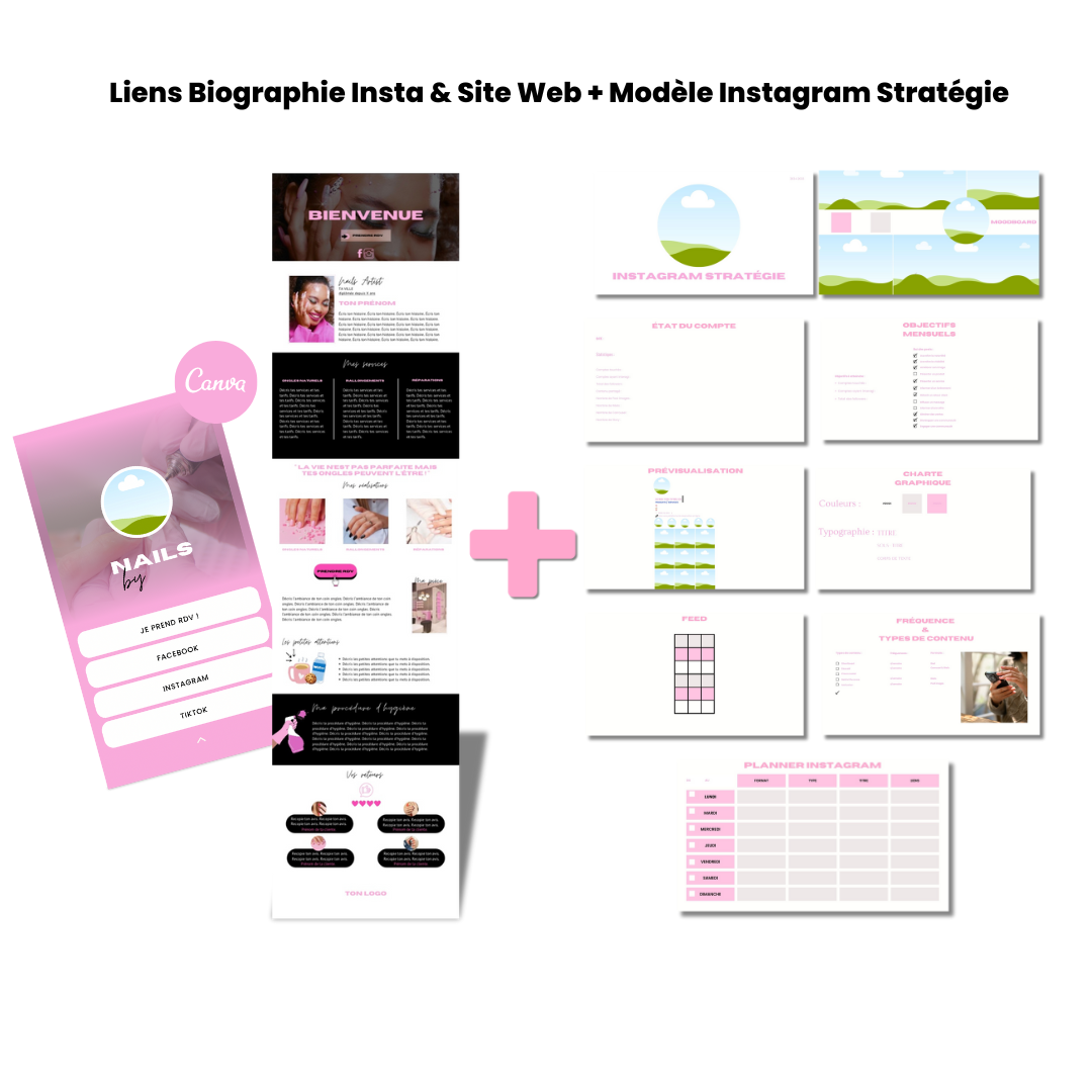 Gagne du temps : Plus besoin de passer des heures à créer des visuels ou des documents. Nos templates sont prêts à l'emploi et pré-remplis, te permettant de te concentrer sur ce qui compte vraiment : tes clientes et ton art.